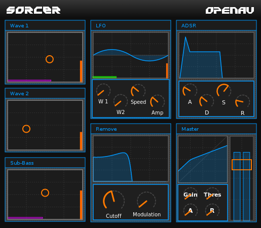 Sorcer is a polyphonic wavetable synth LV2 plugin. Its sonic fingerprint is one of harsh modulated sub-bass driven walls of sound. Two morphing wavetable oscillators and one sine oscillator provide the generation routines. The LFO can be mapped to wavetable modulation as well as filter cutoff. An ADSR allows for shaping the resulting sound, while a master volume finishes the signal chain. Easily creating a variety of dubstep basslines and harsh pad sounds.
